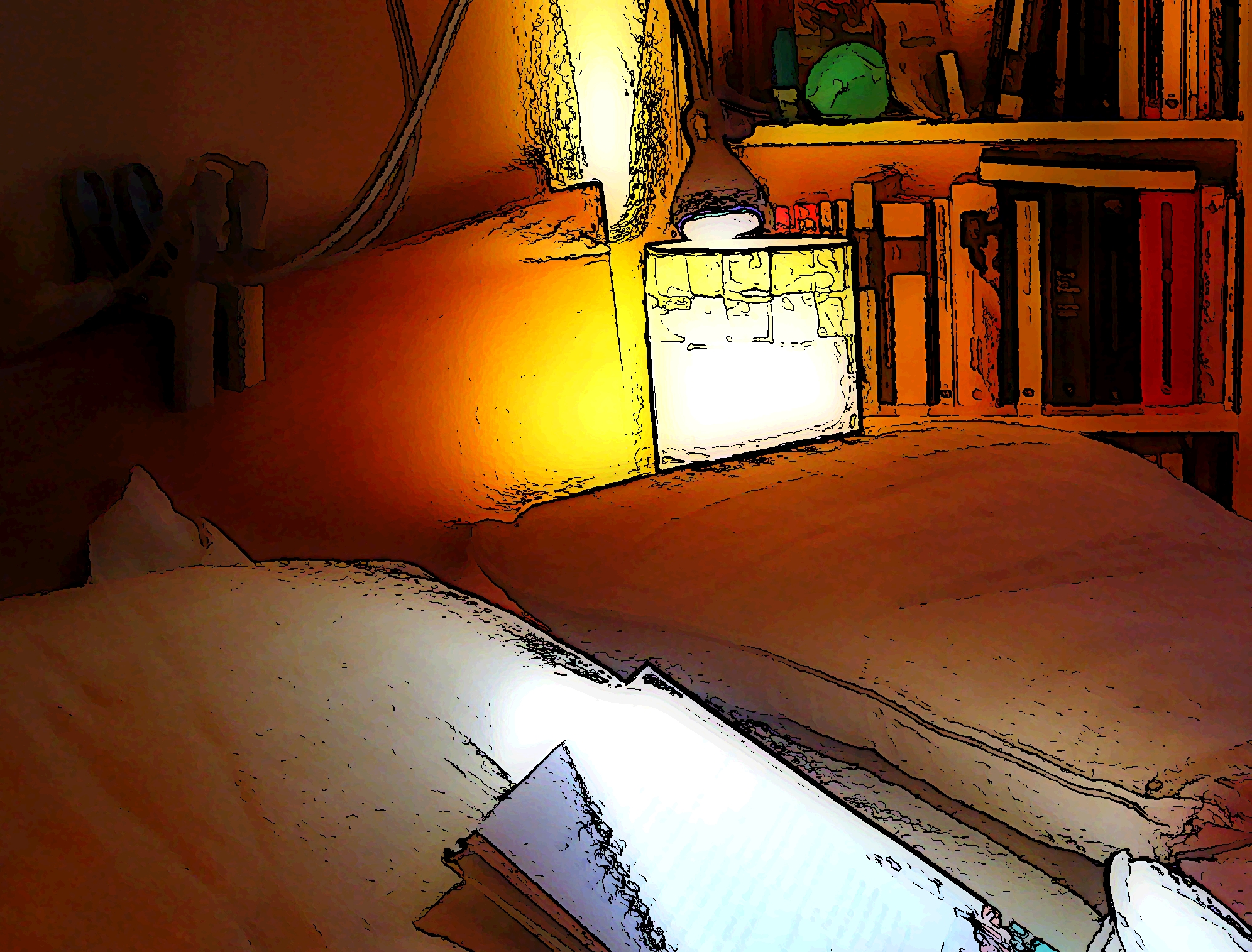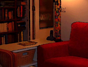 Sabía que el azul-gris era el azul tintín que mencionaste en un comentario hace un par de semanas, vecino querido (aunque en realidad pensaba en el suéter del nuevo amor de la princesa Jade), y aquí está la prueba. No soy demasiado amiga de los cómics, nunca lo fui. Lo que me despierta un ansia irresistible son esos rincones cálidamente iluminados… si fuera ya-sabes-quién, suspiraría.
